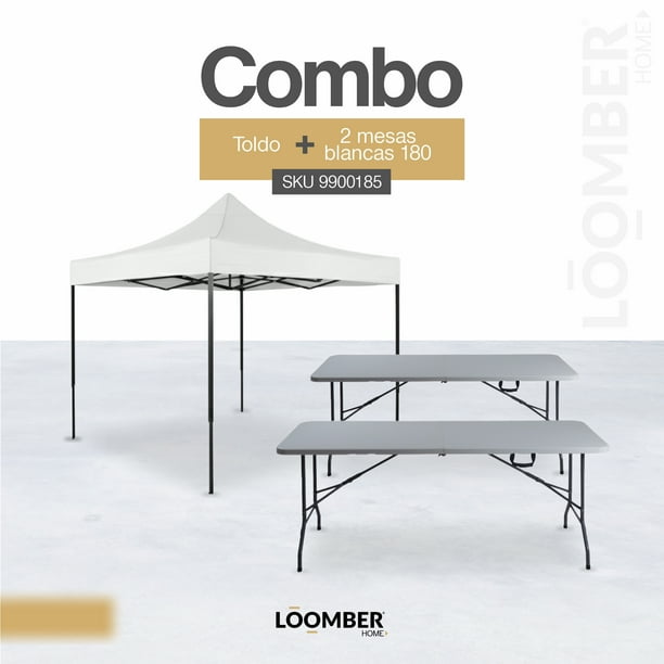 Combo Toldo Padua Blanco Impermeable 3x3 con Dos Mesas Plegables Blancas 1.8 metros Tipo Portafolio LOOMBER