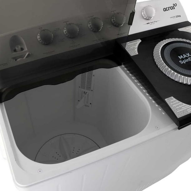 "Nueva Lavadora Doble Tina, ahora con 22 kg de capacidad, te permite lavar hasta 75 playeras o un edredon matrimonial; lavando hasta 3 cargas en 45 min; Con Sus Controles MAX Spin Dry obtén una Máxima velocidad de exprimido, prendas 50% más secas, así mismo si olvidaste incorporar algún elemento sólo abre la tapa para detener el ciclo y continúa el proceso con sólo presionar un botón cuando tú lo decidas. Nuevas Lavadoras Acros con Más Capacidad, inspiradas en tus momentos."