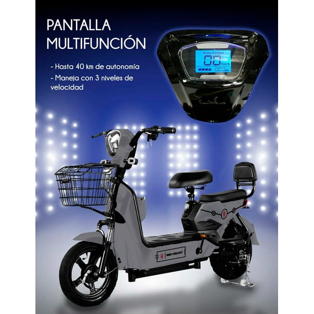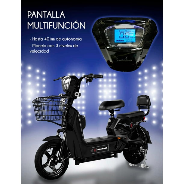 Canasta Delantera Incluida: Ideal para llevar tus compras, pertenencias o lo que necesites.Asiento Cómodo con Respaldo: Disfruta de viajes confortables, incluso en trayectos largos.Batería de Larga Duración: Recorre más kilómetros con una sola carga.Fácil de Usar y Maniobrar: Perfecta para conductores de todos los niveles.Económica y Ecológica: Ahorra en combustible y contribuye al cuidado del medio ambiente.Marca Red Velvet: Calidad y confianza en cada viaje.Ideal para Traslados Diarios: Perfecta para ir al trabajo, a la escuela o a hacer mandados.Diseño Compacto: Fácil de estacionar y almacenar en espacios reducidos.Conducción Suave y Segura: Disfruta de un viaje cómodo y estable en todo tipo de terrenos.Suspensión Delantera y Trasera: Absorbe los impactos y vibraciones para una experiencia de conducción superior.Frenos de Tambor Delanteros y Traseros: Frenado potente y confiable en cualquier condición climática.Diseño Robusto y Duradero: Construida para resistir el uso diario y ofrecerte años de rendimiento.Pantalla Multifunción Intuitiva: Monitorea tu velocidad, autonomía y nivel de batería con facilidad.Hasta 40 km de Autonomía: Disfruta de largos paseos y traslados sin preocuparte por recargar.3 Niveles de Velocidad Ajustables: Adapta tu conducción a diferentes terrenos y preferencias.Potente Motor de 350W: Disfruta de una conducción ágil y eficiente en todo tipo de terrenos.Batería de 48V/12AH de Larga Duración: Recorre más kilómetros con una sola carga, ideal para traslados diarios.Diseño Urbano y Elegante Red Velvet: Estilo moderno y atractivo, perfecto para la ciudad.