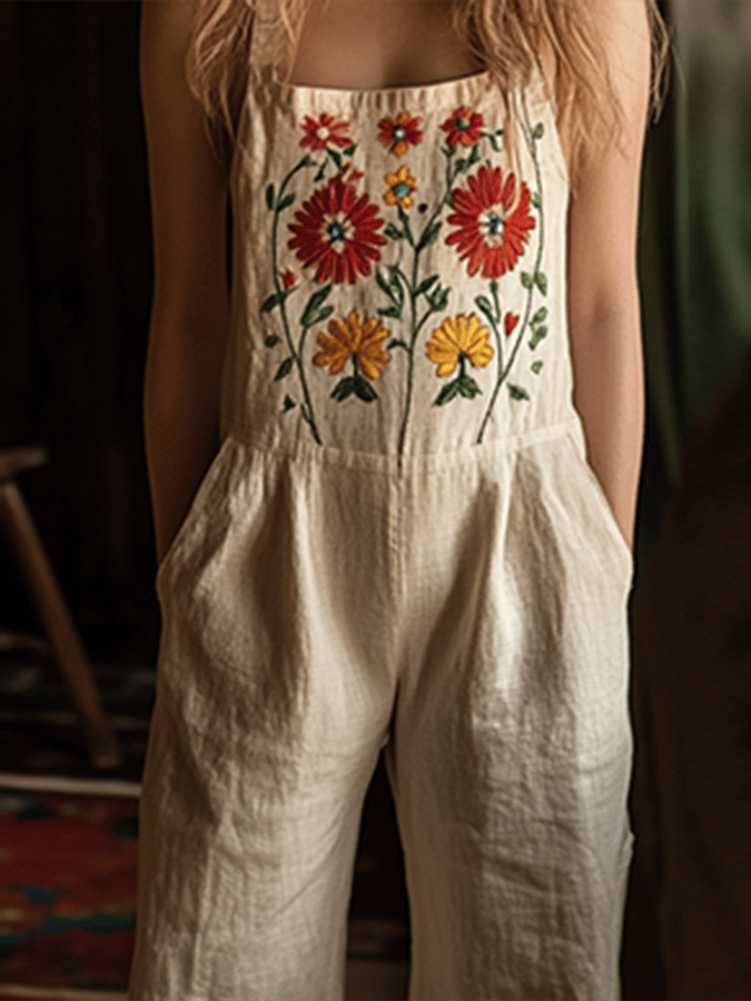 Women's Vintage Floral Embroidered Pattern Art Linen Blend Loose Casual Jumpsuit